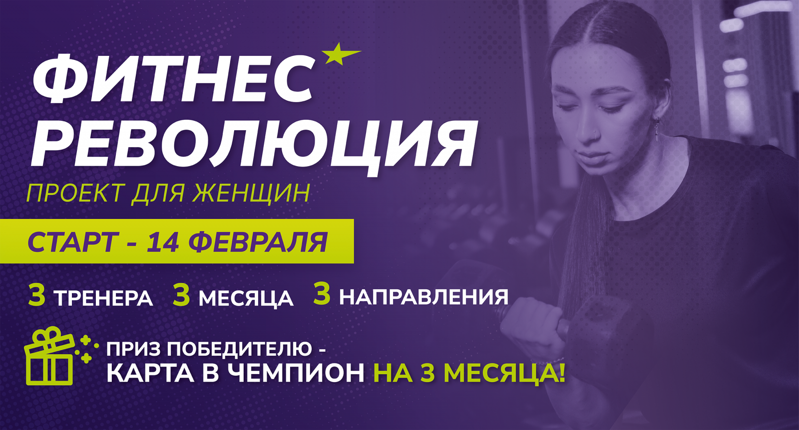 14 февраля начинается наш уникальный фитнес-проект «Фитнес-Революция»! Это ваш шанс исполнить давнее обещание начать тренироваться. За 90 дней вы под руководством экспертов попробуете 3 разных спортивных направления, чтобы максимально эффективно достичь своей цели!